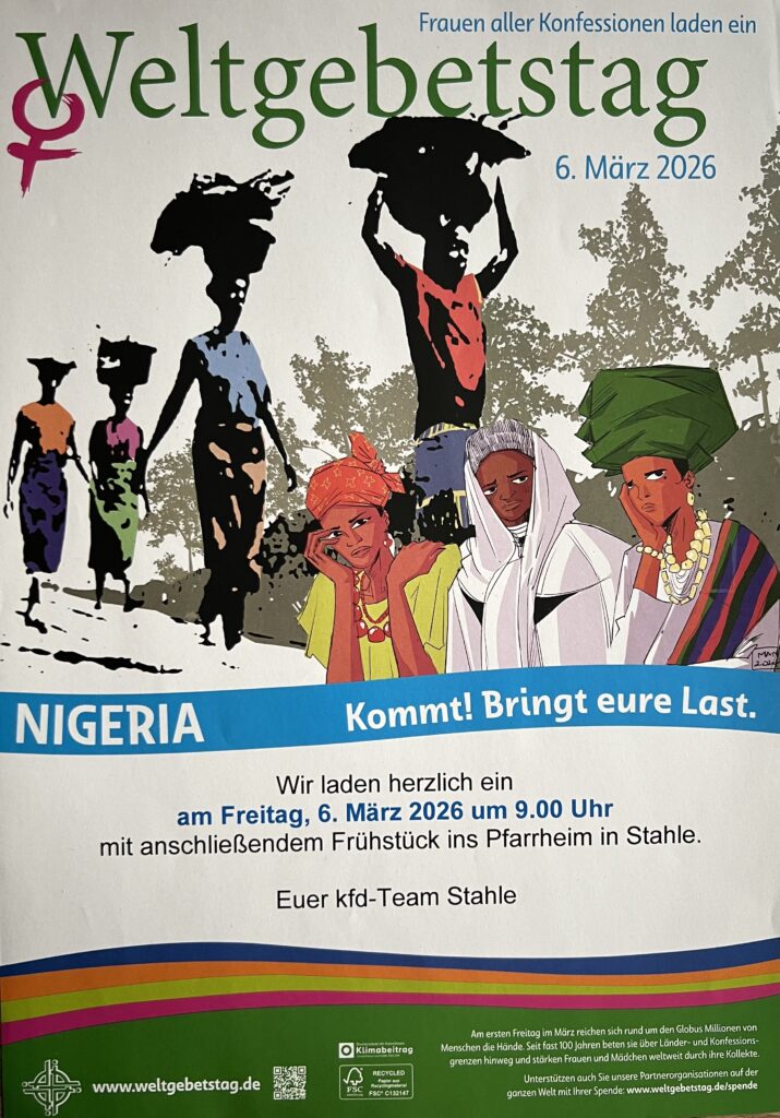 Wir laden alle Frauen herzlich ein zum Weltgebetstag der Frauen „NIGERIA – K0mmt! Bringt eure Last.“ am Freitag, 6. März 2026 um 9.00 Uhr mit anschließendem Frühstück im Pfarrheim in Stahle.