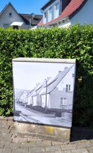 Ein Blick in die Straße Im Mittelfeld mit den typischen Siedlungshäusern aus den 1950er Jahren, die damals von oberirdischen Stromleitungen über Strommasten versorgt wurden.